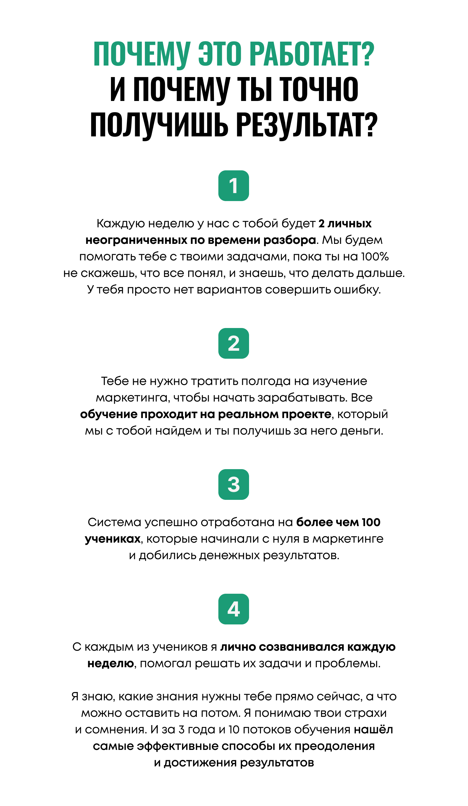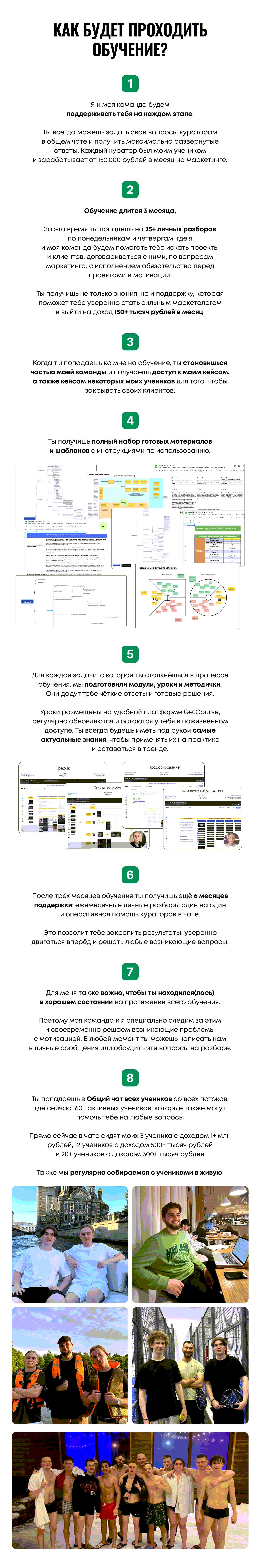 Не советую новичкам начинать с комплексного маркетинга. Лучше стартовать с простой связки услуг, набраться опыта и довести результаты до уверенности.