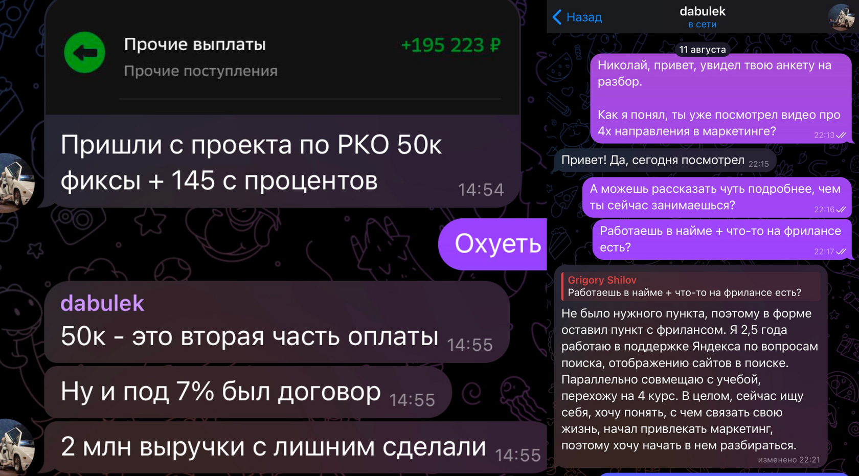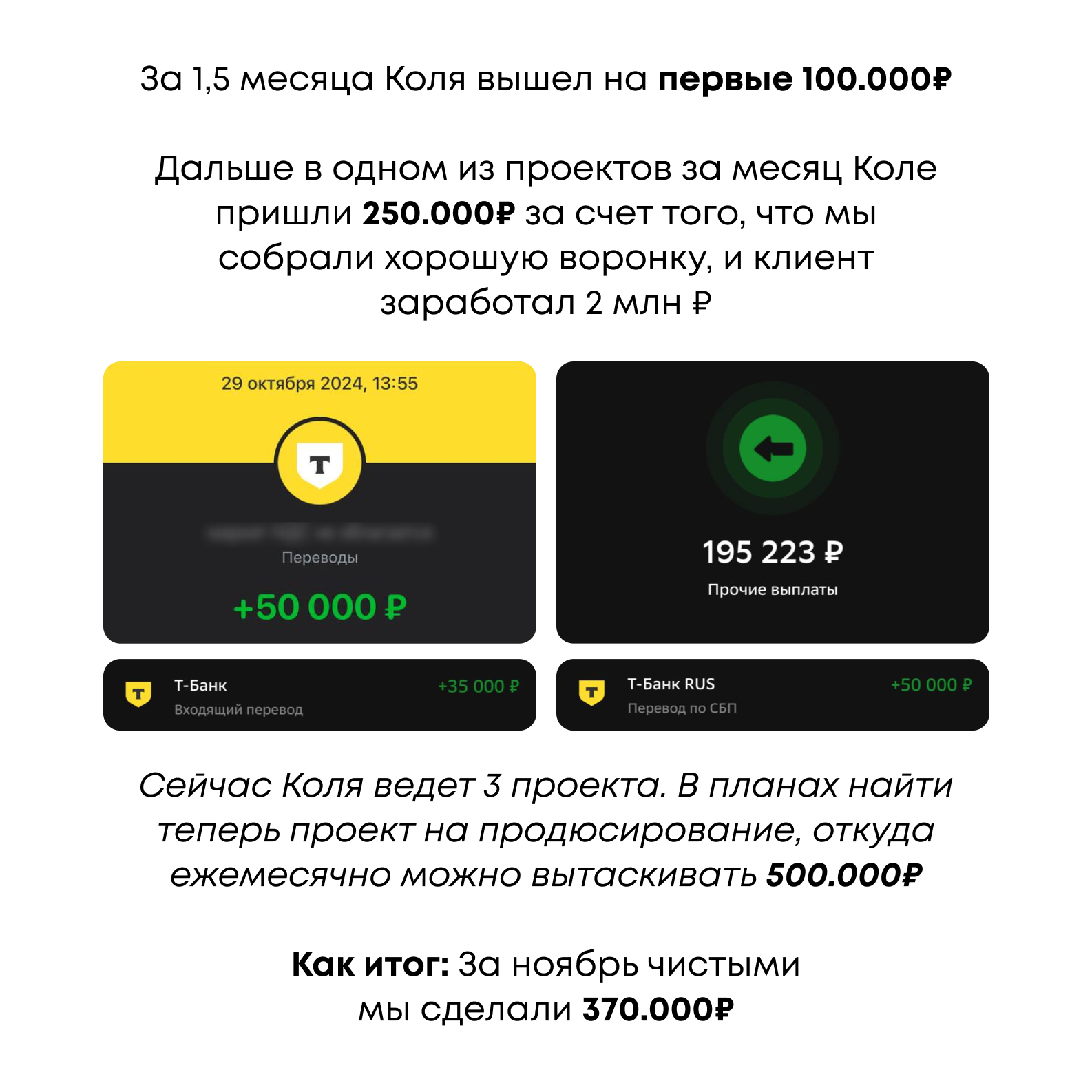 Так одна из моих учениц — Лиза закрыла 3 экспертов за обучение. С одним из них она сделала 5 млн рублей выручки. По итогу чистыми с проекта она заработала 1,2 млн рублей.