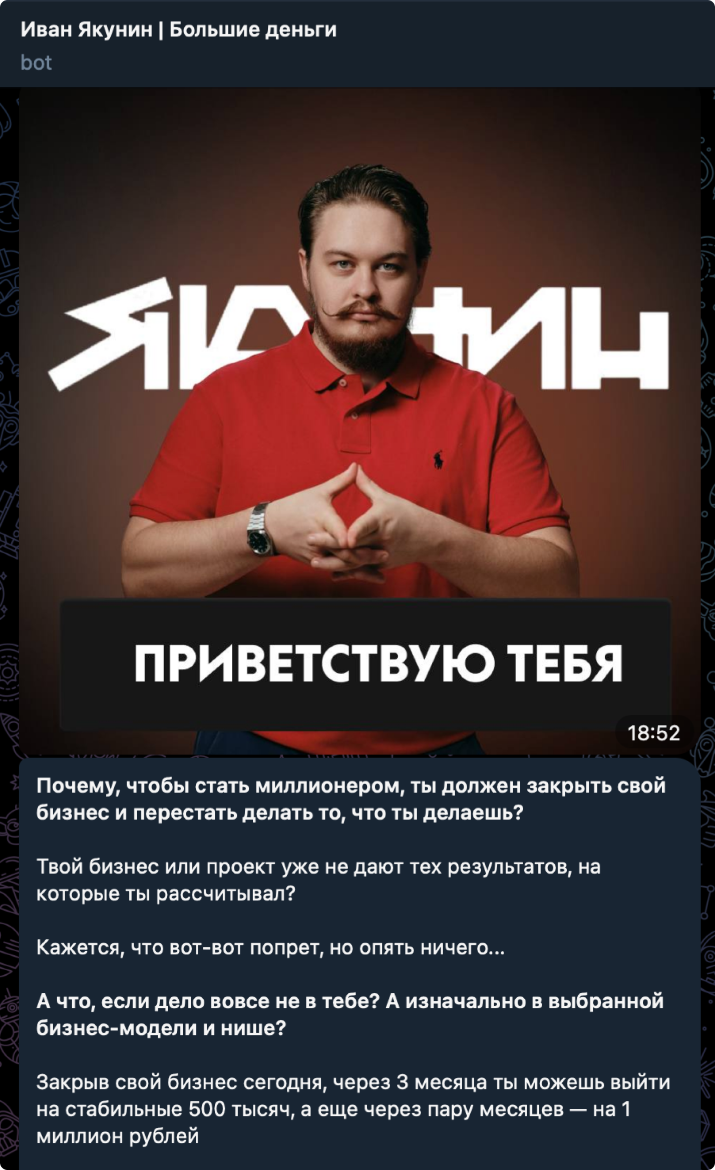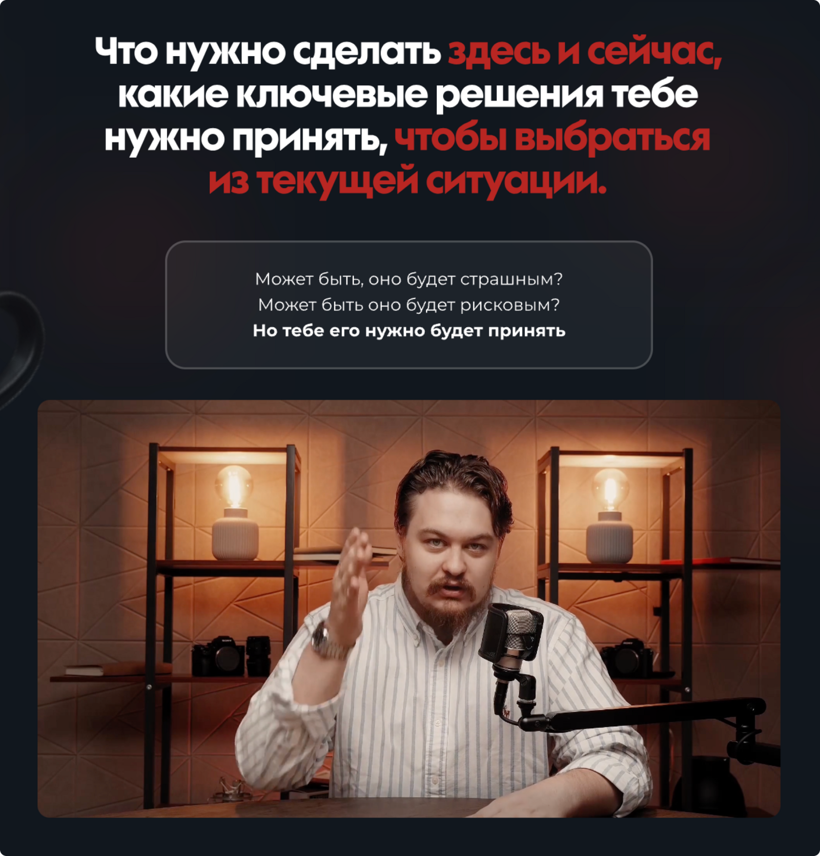 В конце видео мы приглашаем человека на разбор, где подробно анализируем его бизнес-ситуацию и предлагаем конкретное решение. Если клиенту всё подходит, он приобретает премиальный продукт эксперта.