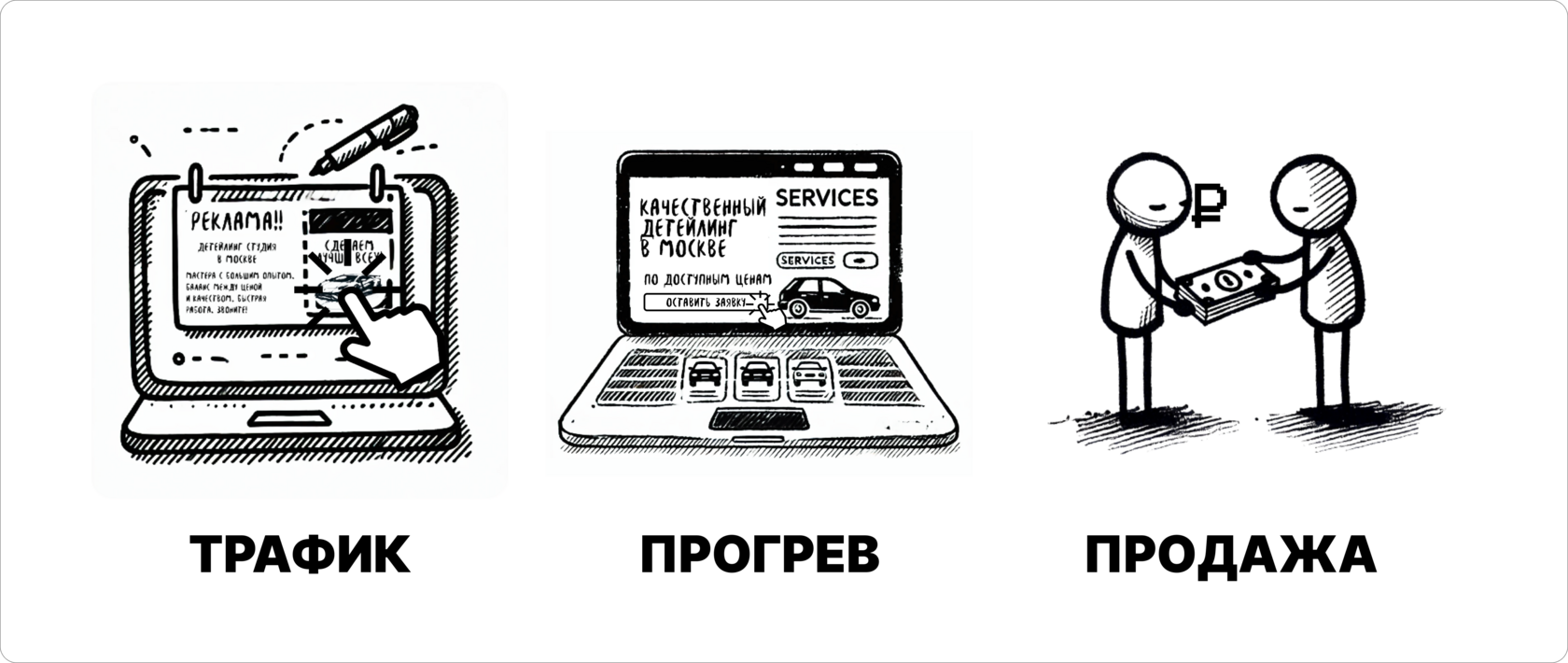Самая простая связка — это трафик + прогрев. Трафик можно привлекать через Яндекс. Директ, VK рекламу, Reels, Instagram или другие инструменты, которые цепляют потенциального клиента.