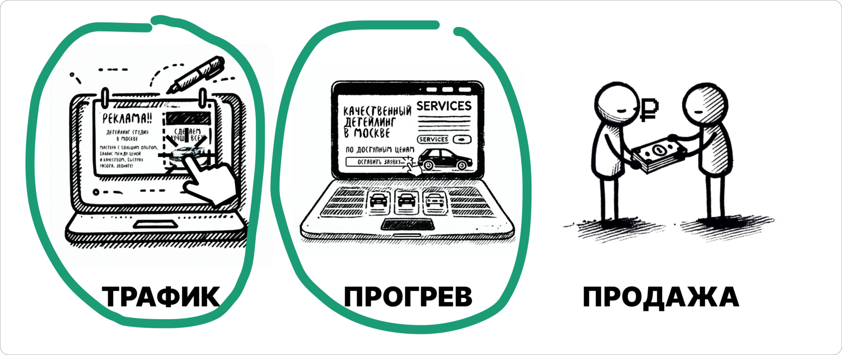 Часто у клиентов проблемы и с прогревом, и с трафиком. Если, например, ты предложишь только трафик из Яндекс.Директ, но у клиента слабый сайт, результата не будет.
