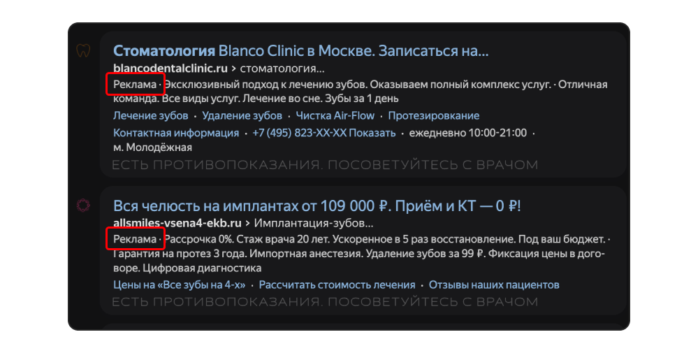 Например, если ты ищешь «Стоматология в Москве», на первых строчках тебе покажут рекламные предложения московских стоматологий.